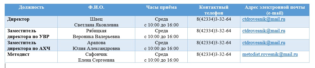 ЧАСЫ ПРИЕМА АДМИНИСТРАЦИИ МБОУ ДО ЦДТ «Ровесник»