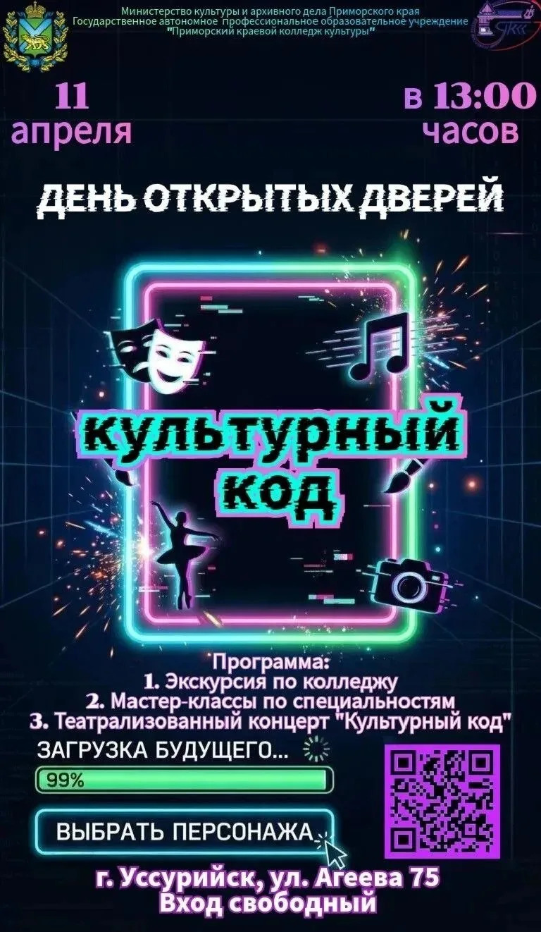 Приморский краевой колледж культуры приглашает обучающихся 9-11 классов общеобразовательных организаций, детских школ искусств, участников творческих коллективов и их родителей на День открытых дверей, который состоится 11 апреля 2026 года в 13.00 часов.